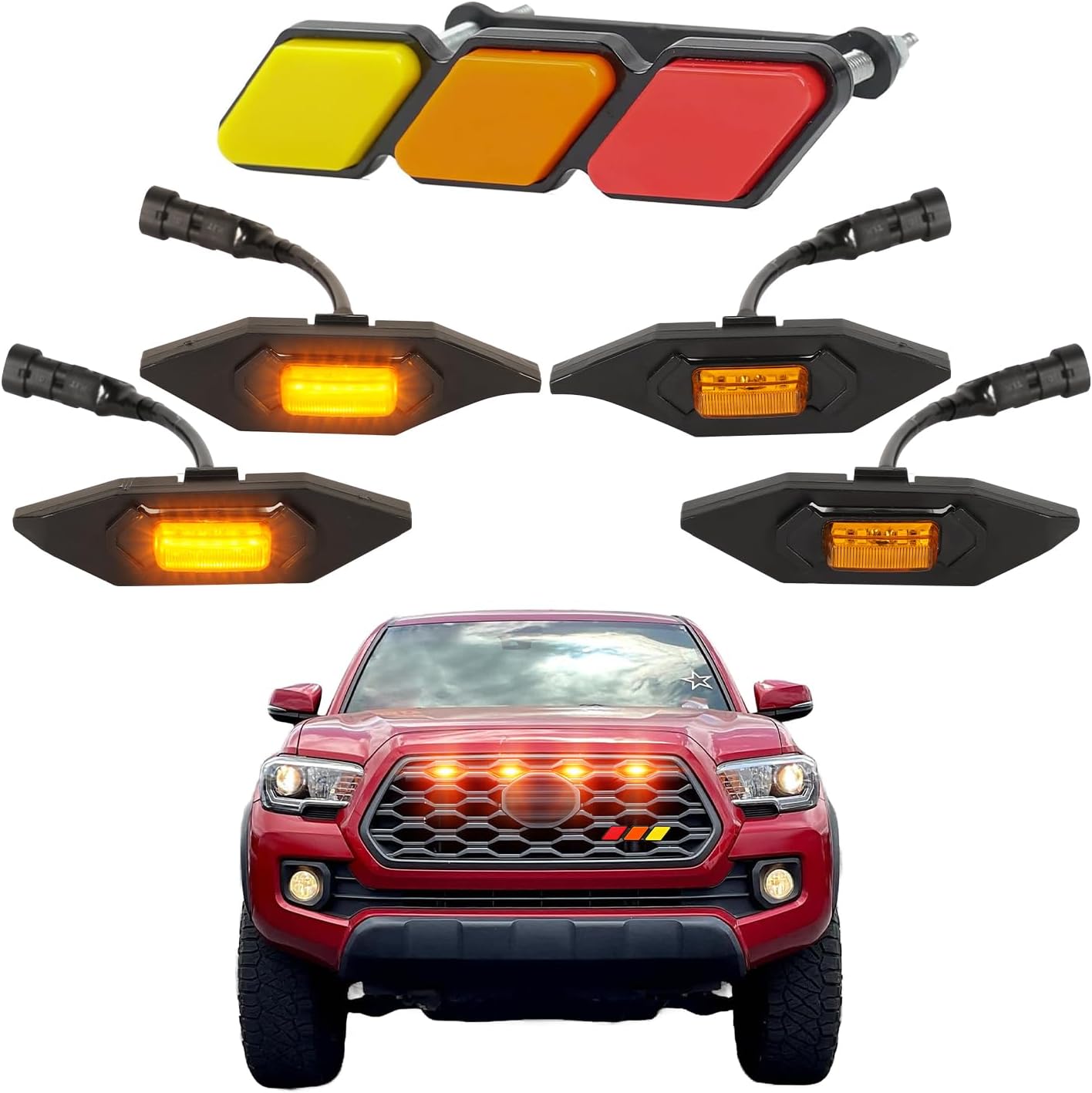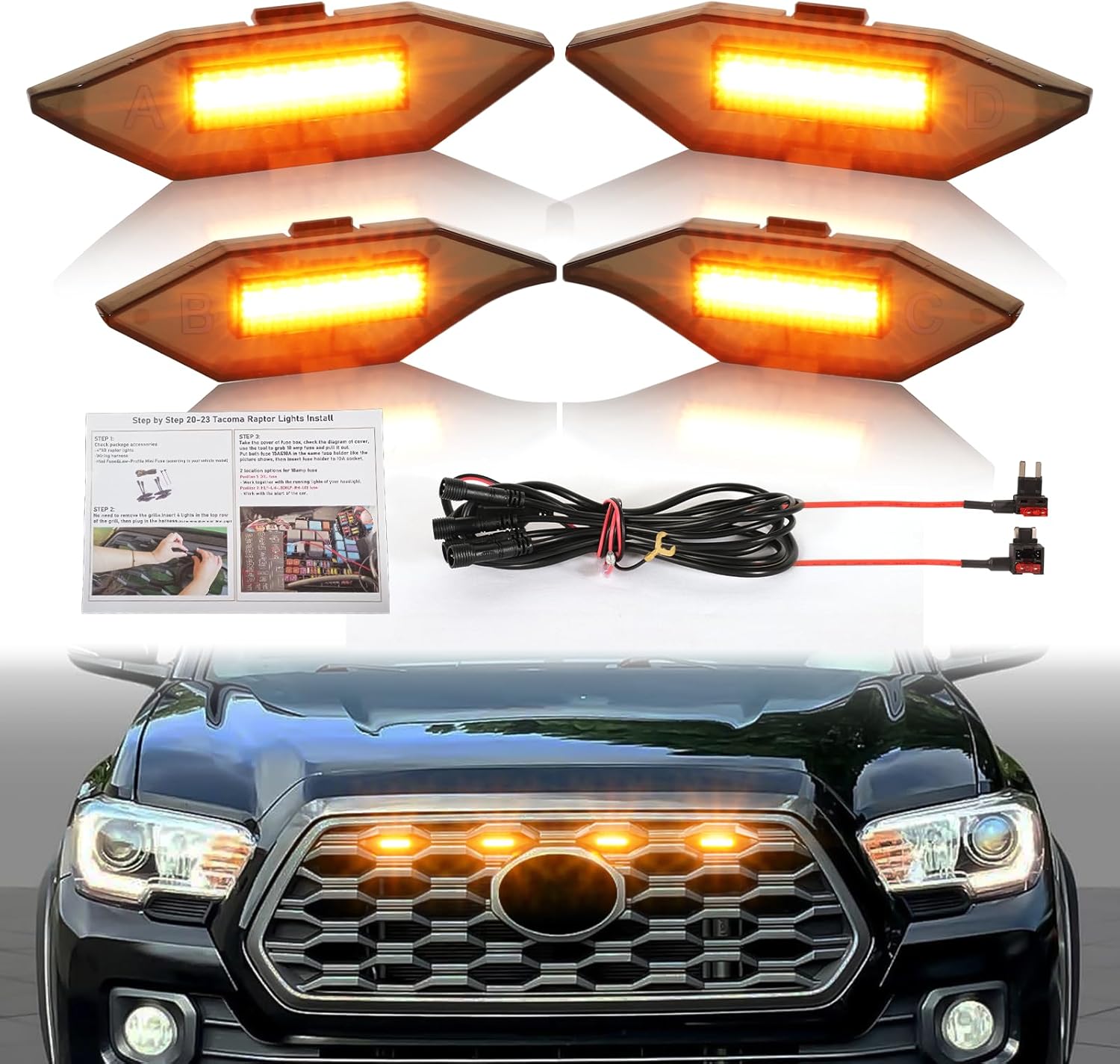 ● Why do you need the grill lights?1. Boost the original appearance of the car: bring a new look, bright and makes your truck stand out more.2. Safe driving: as auxiliary lights, bright and eye-catching, improve safety when driving in Rainy, snowy or foggy days.● ADAPT TO ANY WEATHER CONDITIONAfter been upgraded, its toughness has been improved, and it can work in both high and low temperature weather.● WATERPROOF UPGRADEWe have glued the inside and outside of the water inlet, double protection to avoid water.Warm reminder: to prevent the clips from breaking while installing in a low temperature environment, soak the clip in warm water to soften it before installing.Compare our grille lights to other :Compared with the raptor lamp with only 4 LED Beads on the market, ours has 6 LED Beads, which are brighter and more beautiful.● For 2020 2021 2022 2023 Tacoma TRD Off Road and Trd Sport models or other models with TRD Sport OEM grille.Packing List:1 * Wiring harness2 * Fuse adapter1 * User manual