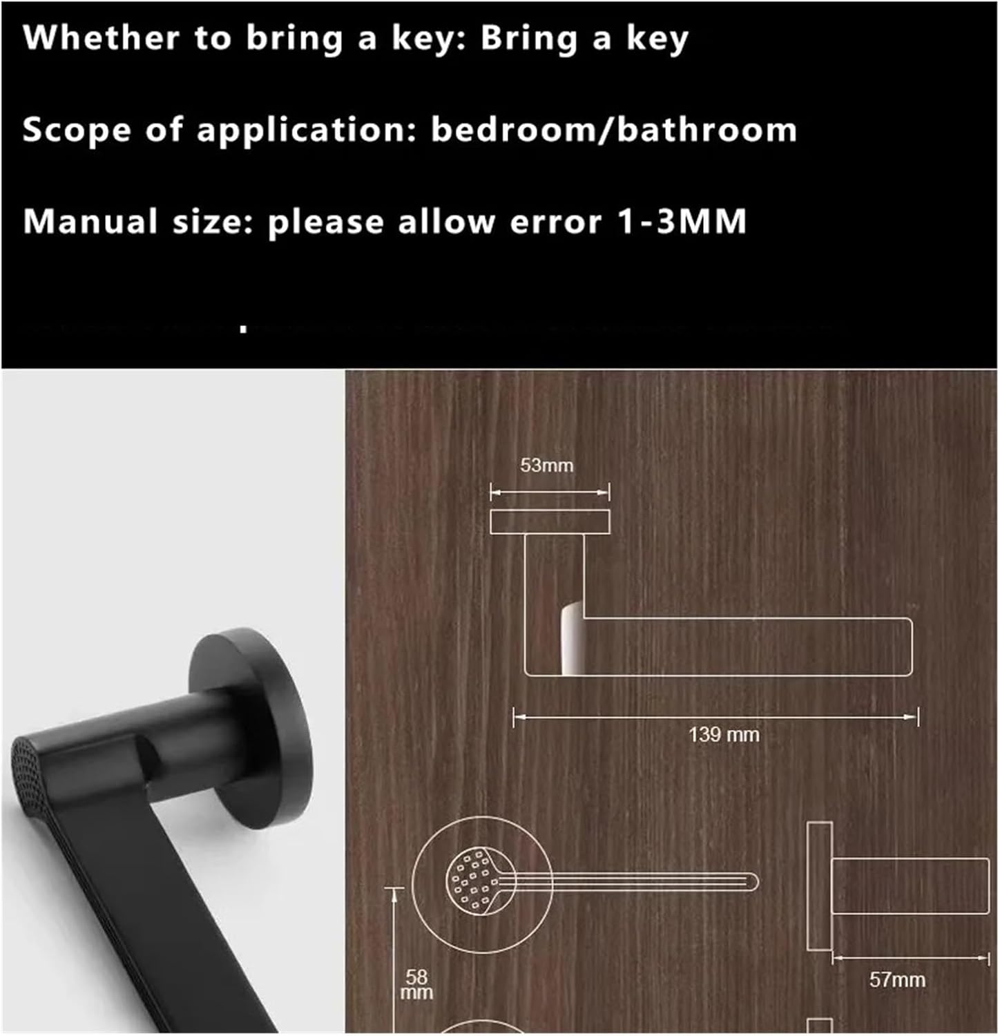 Product material: zinc alloyHandle material: zinc alloyLock margin: 45MMInstallation direction: no matter left or rightCenter distance: 58MMApplicable door thickness: 35-45MMWhether to bring a key: Bring a keyScope of application: bedroom/bathroomProduct color: starry sky gray/matte black/bright chrome/copper brushed/PVD goldManual size: please allow error 1-3MMNote: Due to the shooting angle, lighting will inevitably cause chromatic aberration.Please refer to the actual object==========High-concerned chemical : NoneIs Smart Device : NoKeys Included : YesFit Door Thickness : 35-45mmApplication : bedroomSurface Finishing : ElectroplatedMaterial : Zinc AlloyModel Number : bathroom door lock-0158Product material : zinc alloyHandle material : zinc alloyLock margin : 45MMInstallation direction : no matter left or rightCenter distance : 58MMApplicable door thickness : 35-45MMWhether to bring a key : Bring a keyScope of application : bedroom/bathroomProduct color : tarry sky gray/matte black/bright chrome/copper brushed/PVD gold